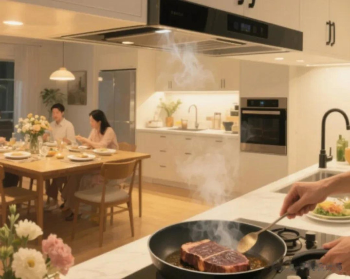 当初执着要做开放式厨房,一是觉得显空间大,二是想做饭时能跟客厅的家人聊天。结果第一次炒辣椒就破防了 —— 油烟机开最大档,辣椒味还是飘得满屋子都是,沙发、窗帘上全是味,连衣柜里的衣服都带着油烟气。