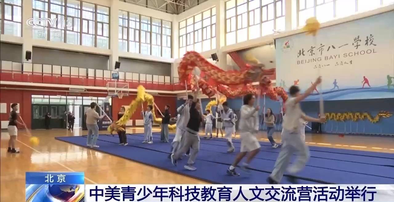 r在北京市八一学校,中美学生一对一结伴,沉浸式体验京剧、舞龙、武术、皮影戏、陶艺等特色文化课程。在舞龙课上,中美学生一同举起龙杆,伴随节奏起跑,大家调整脚步、默契配合。